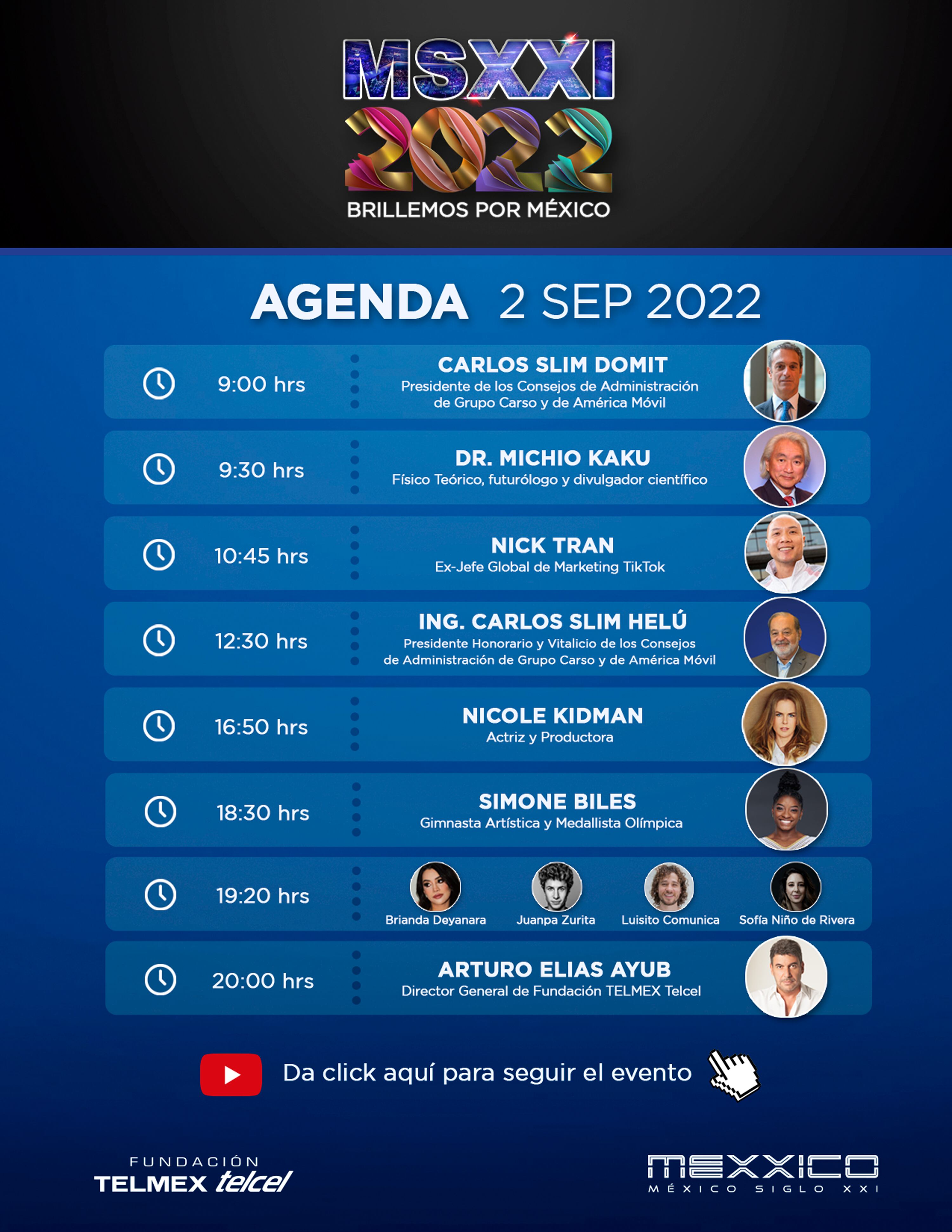 Entre los ponentes de este año se encuentran el Dr. Michio Kaku, físico teórico especialista en la teoría de cuerdas; el Ing. Carlos Slim Helú, empresario, filántropo e impulsor del talento mexicano; Nicole Kidman, multipremiada actriz y productora; así cómo Simone Biles, gimnasta y medallista olímpica, entre otros.