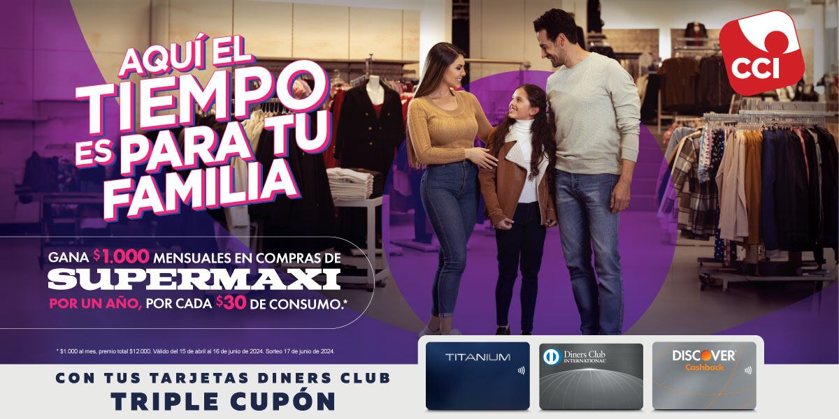 Por eso, CCI premia tu fidelidad y te premia con 1 año de compras en Supermaxi por tus compras de USD$30. Recibe un cupón para participar en esta impresionante campaña y recibe triple cupón con tarjetas Diners Club.