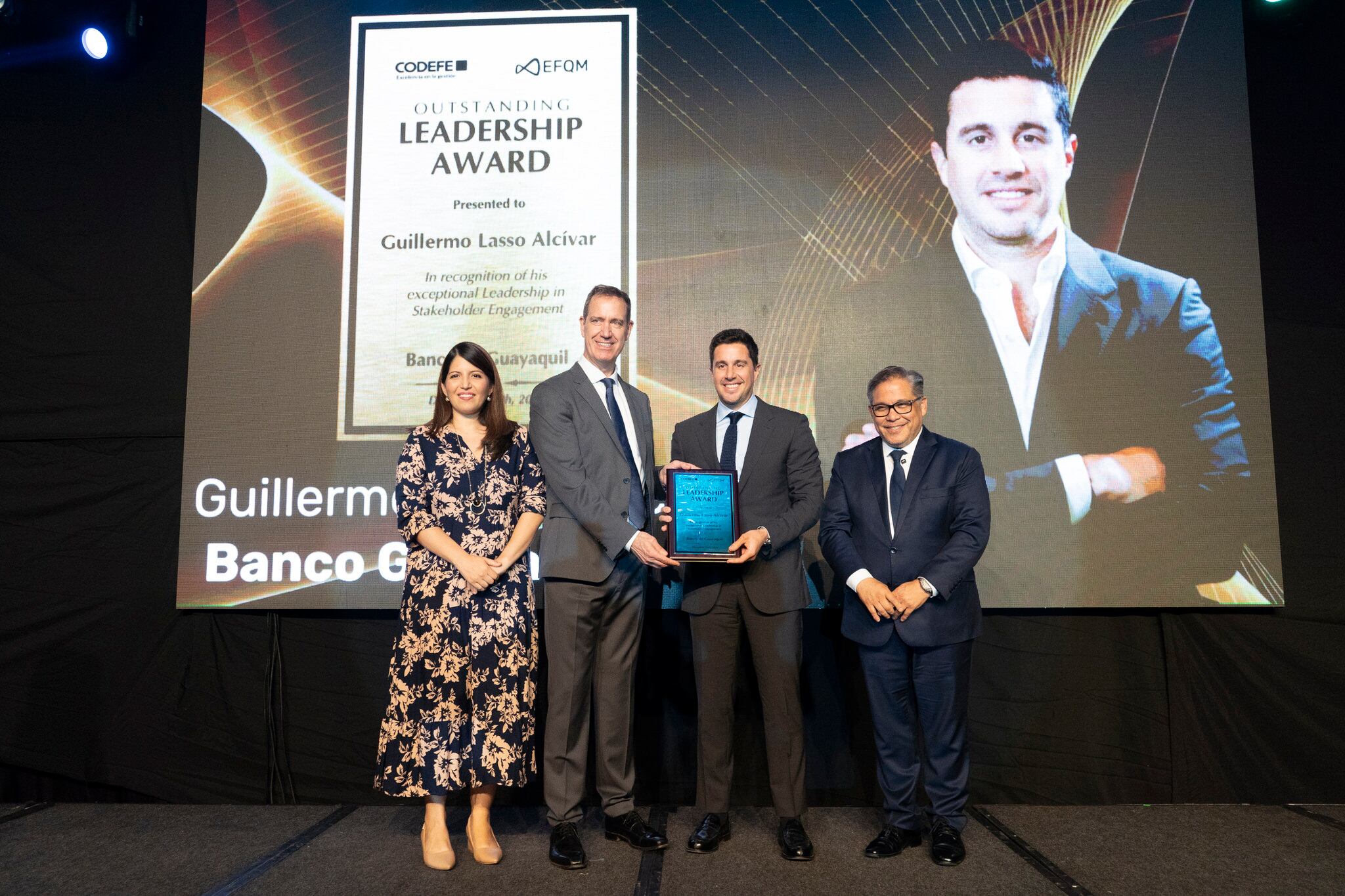 El presidente ejecutivo de Banco Guayaquil, Guillermo Lasso Alcívar, recibió un distintivo de Liderazgo en la categoría de “Compromiso con los Grupos de Interés”, otorgado por la European Foundation for Quality Management (EFQM), reconociendo la gestión de excelencia de los líderes más importantes de distintos países, destacando su impacto positivo y compromiso empresarial.