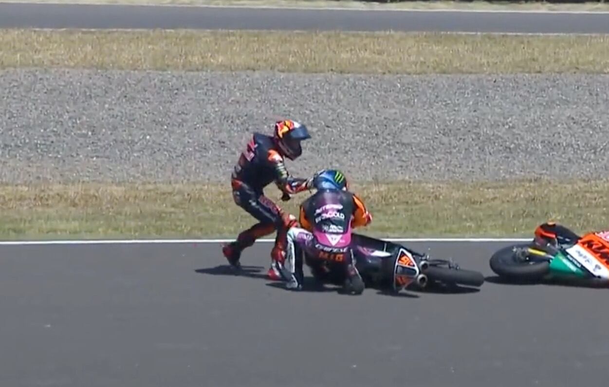 Durante el Gran Premio de la República Argentina, el italiano Andrea Migno (Honda) tuvo un contacto con el español Jaume Masia (KTM), en la vuelta 15.