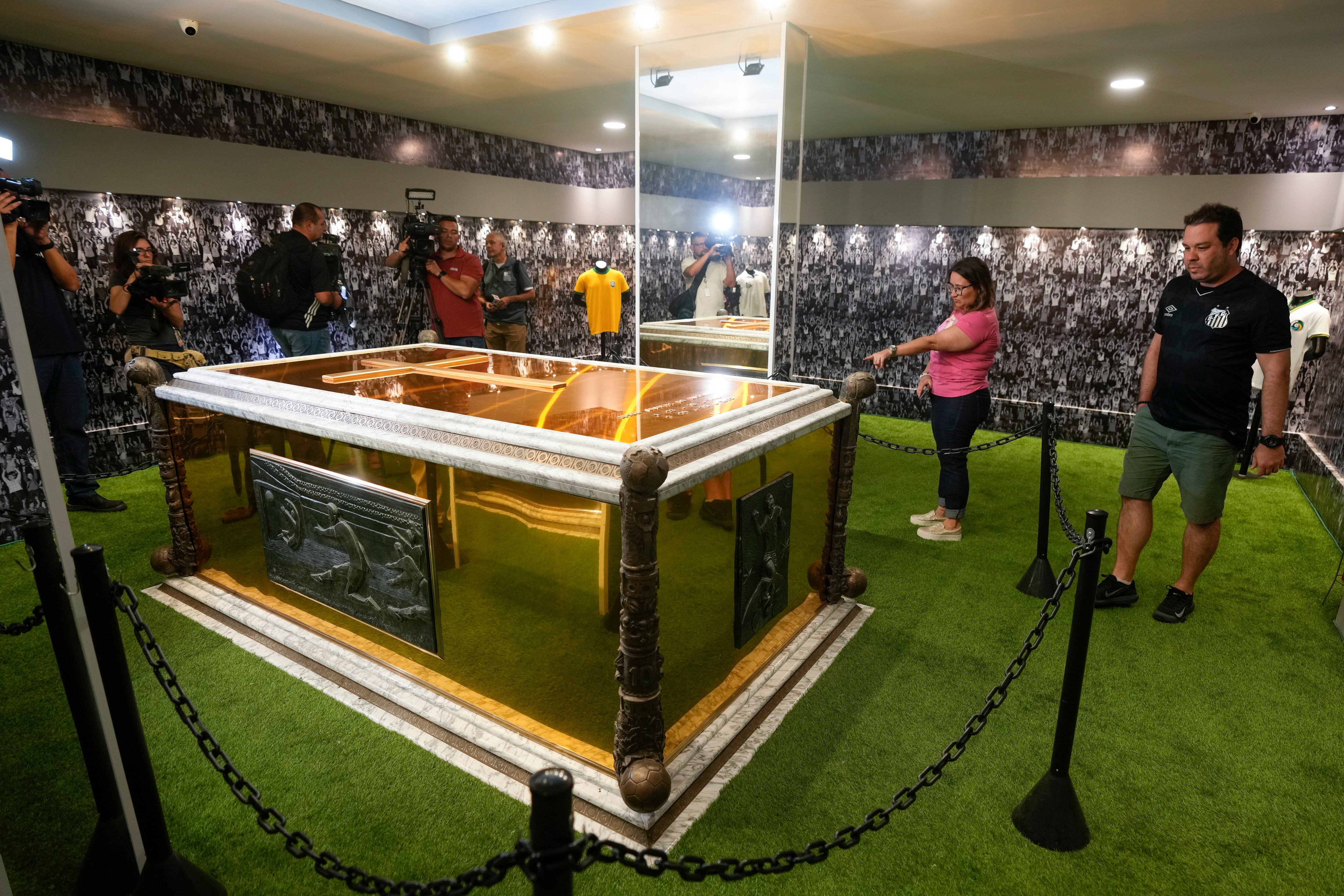 El mausoleo que se construyó para albergar el féretro dorado de Pelé comenzó a recibir visitantes el lunes. En el segundo piso de un cementerio vertical en la ciudad de Santos, en las afueras de Sao Paulo, el mausoleo recibe a los aficionados con dos estatuas doradas de Pelé.