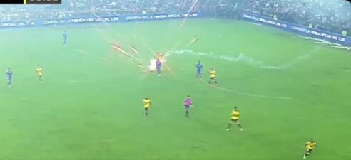 Fue al minuto 55, donde el arquero Contreras terminó por lanzarse al pasto en señal de afectación por los residuos del proyectil en cuestión. Una vez suspendido el encuentro, los jugadores ‘Canarios’ intentaron salir de la cancha pero los fanáticos rivales lo impidieron al arrojar objetos.