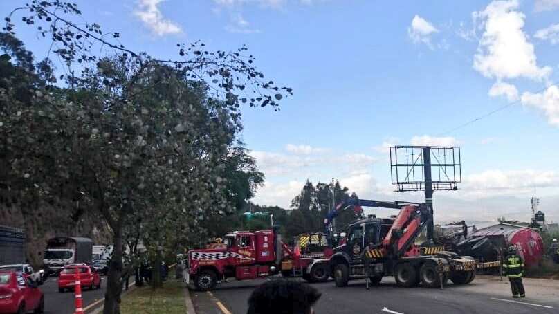 Debido al volcamiento de un trailer de combustible, la Av. Simón Bolívar, en el sector de Santa Rosa, se encuentra totalmente inhabilitada. Se pide a los conductores tomar vías alternas. Personal del la AMT y Bomberos Quito se encuentran realizando el contraflujo en el lugar.