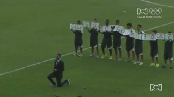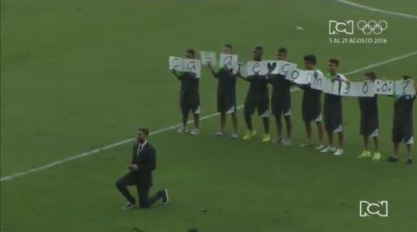 Luis Antonio Calderón esperó al medio tiempo del juego entre su equipo vs Atlético Nacional para salir al terreno de juego y hacerle la proposición a su amada.