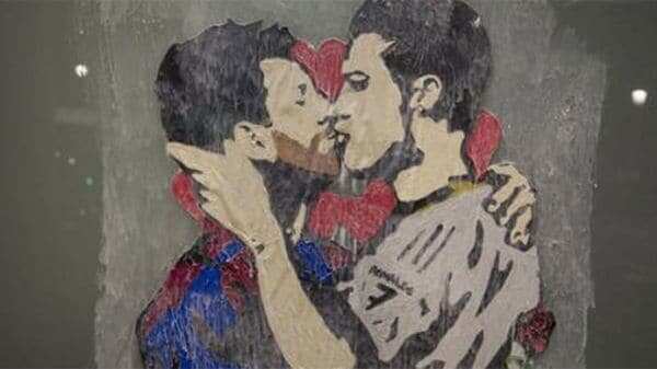 El amor es ciego, así tituló su obra el controvertido artista urbano Tvboy, quien pintó a Lionel Messi y a Cristiano Ronaldo, fusionándose en un apasionado beso.