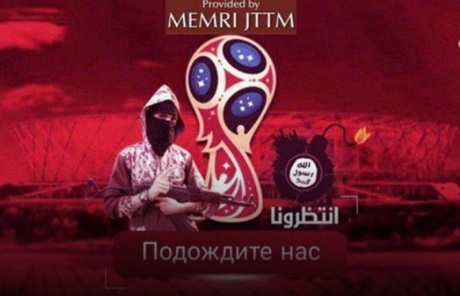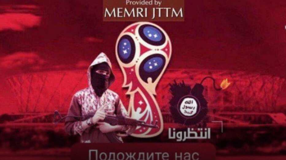 Una imagen distribuida en redes muestra a un terrorista armado con un AK-47 junto a una bomba que lleva la bandera del ISIS, escoltando el logo oficial del Mundial. Al frente puede leerse en ruso y en árabe «esperen por nosotros».