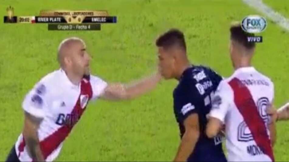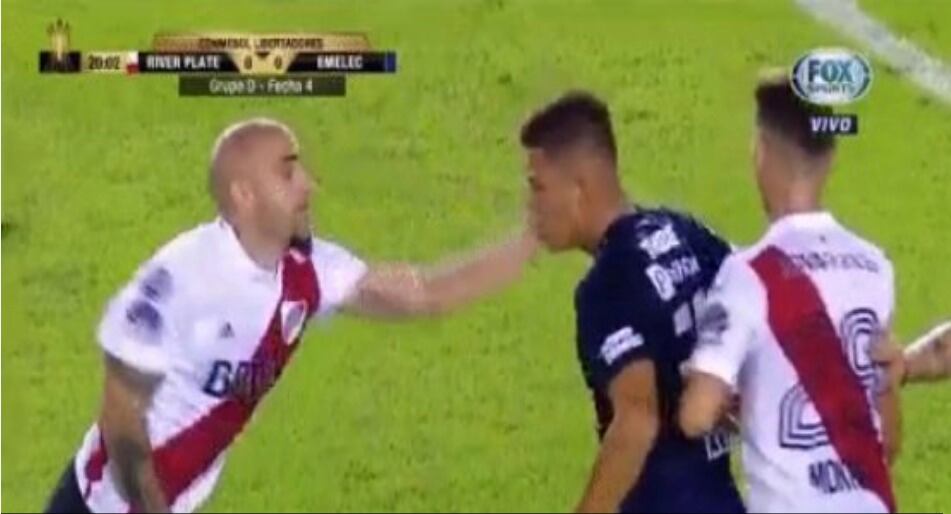 La cadena de deportes, Fox Sports subió un video donde muestra el momento que Pinola de River Plate le cachetea de forma inusual a Marlon de Jesús de Emelec. Este video generó muchas reacciones en las redes sociales.