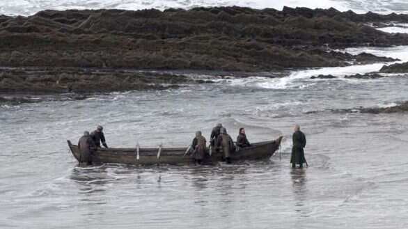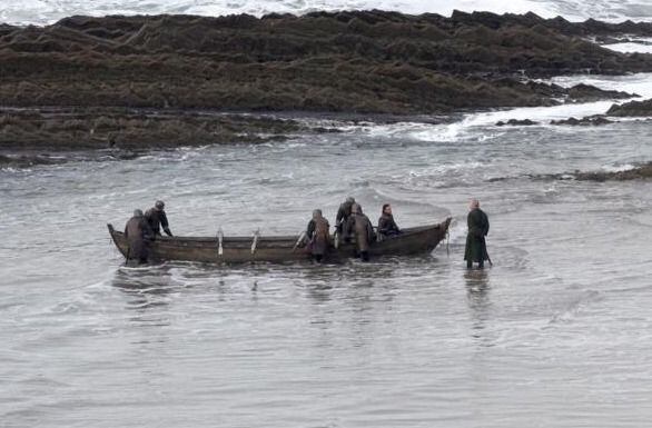 Las postales obtenidas por un observador en la playa Itzurun en Zumaya, a 23 kilómetros de San Sebastián, y publicadas en el portal Watchers on the Wall muestran la llegada de un barco a las playas de Dragonstone, donde Tyrion Lannister recibe a Jon Snow y al personaje de Davos Seaworth.
