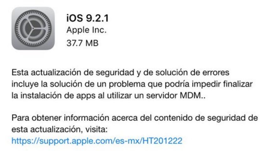 “Esta actualización de seguridad y de solución de errores incluye la solución (sic) de un problema que podría impedir finalizar la instalación de apps al utilizar un servidor MDM”, el cual, según el sitio especializado en tecnología Mashable, había sido descubierto desde 2013.