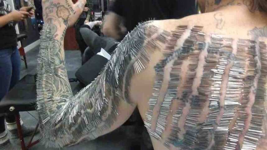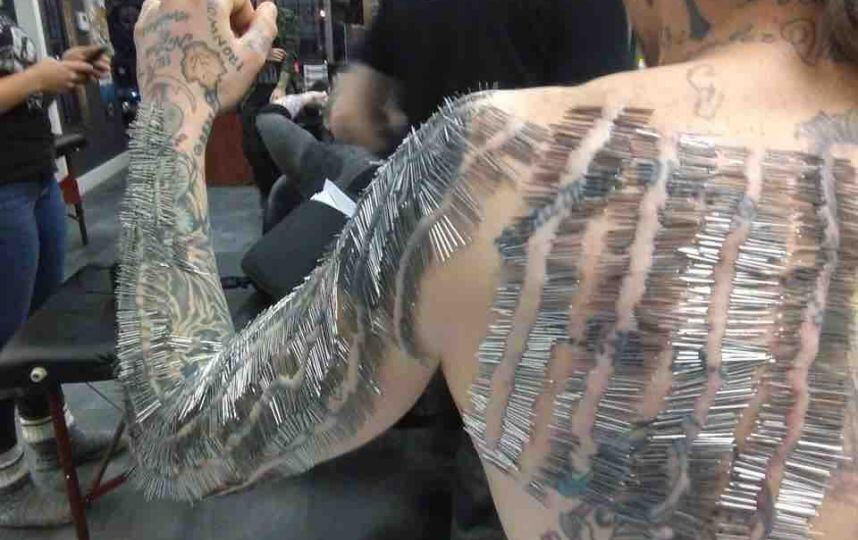 Sin embargo el intenso dolor de las perforaciones no le bastó. Este año con ayuda del especialista en “piercings”, Russ Foxx, aumentó el número de agujas quirúrgicas colocadas en sus brazos y espalda.