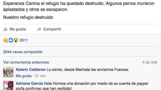 En la página de Facebook de Esperanza Canina, ellos mismos anunciaron la terrible noticia: muchos perros habían fallecido al ser aplastados por los escombros y otros tantos huyeron, siendo casi imposible recuperarlos ya que la ciudad se encontraba sin luz y en medio de un completo caos.