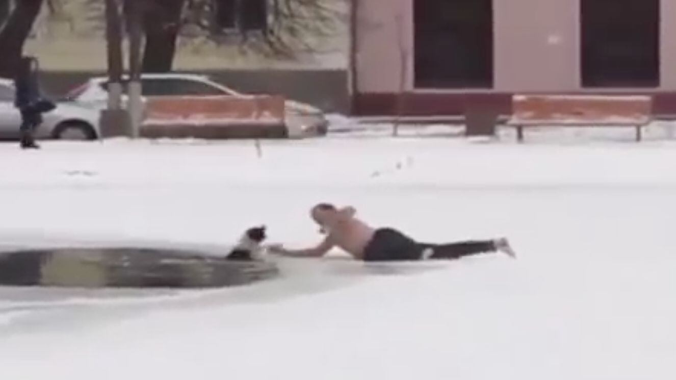 El hombre, ahora considerado un héroe, estaba desnudo de la cintura para arriba y descalzo, pero no parecía molestarle el frío al momento de ayudar al animal.