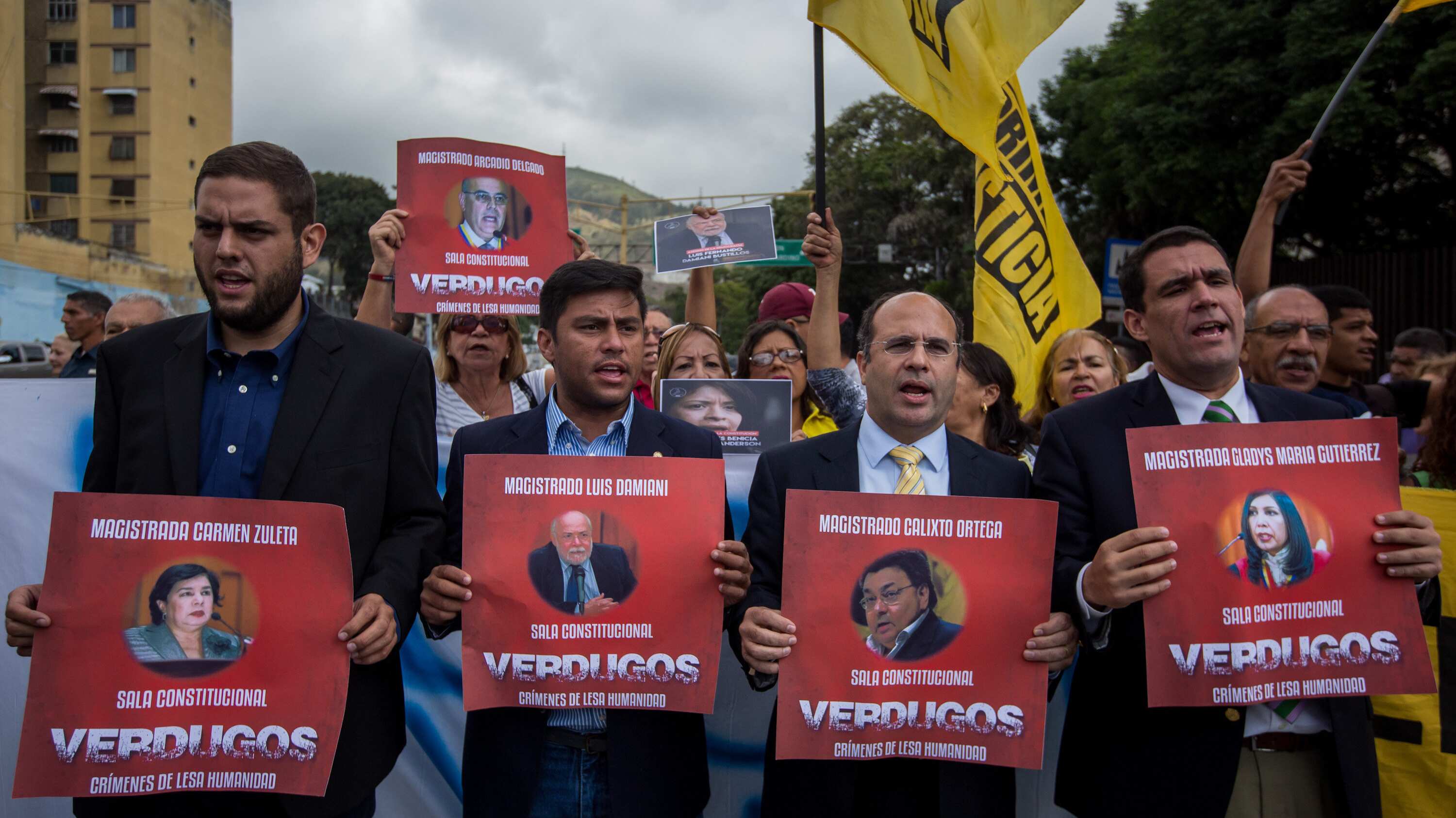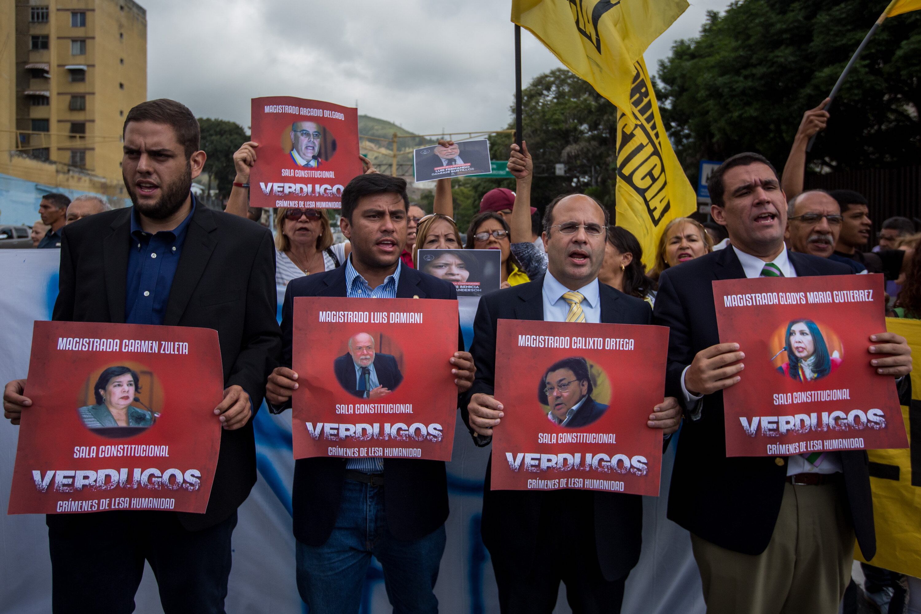 «Son unos magistrados que odian a Venezuela, que son enemigos del pueblo, que son corresponsables del hambre, de la violencia y de la escasez de medicinas que hay en Venezuela, y del secuestro del sagrado derecho a votar», afirmó el diputado Juan Miguel Matheus, que portaba un cartel con el rostro de la presidenta del TSJ, Gladys Gutiérrez.