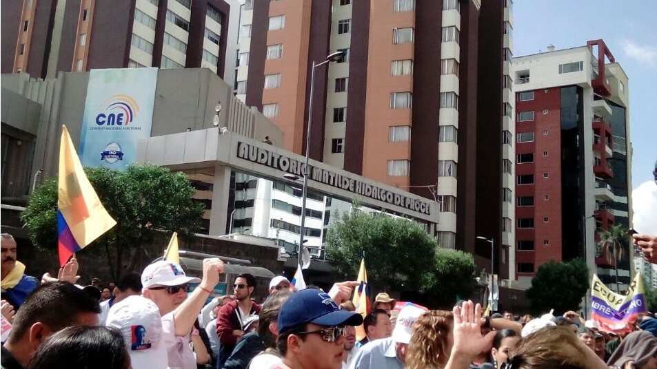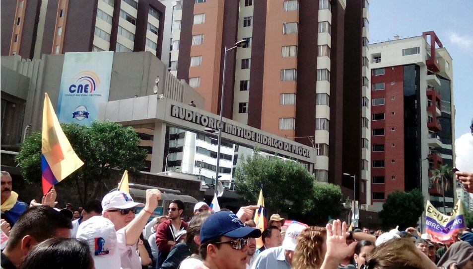A las afueras del Consejo Nacional Electoral (CNE) simpatizantes del candidato por el movimiento CREO, Guillermo Lasso se han convocado a través de las redes sociales a esta concentración para exigir una segunda vuelta.