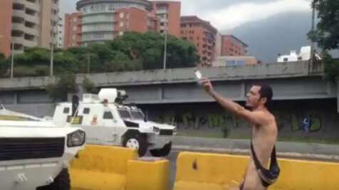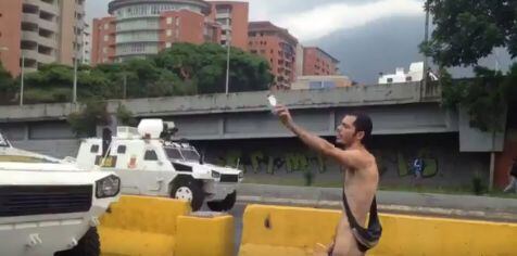 Un joven manifestante se desnudó en la autopista Francisco Fajardo de Caracas. El joven, con una Biblia en la mano, se subió al techo de un tanque de la Policía Nacional Bolivariana (PNB).