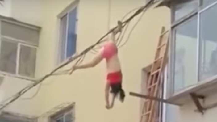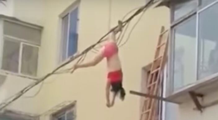 Una mujer, que estaba en ropa interior, fue grabada cuando quedó colgada de unos cables eléctricos de una calle en China después de huir de la esposa de su presunto amante.