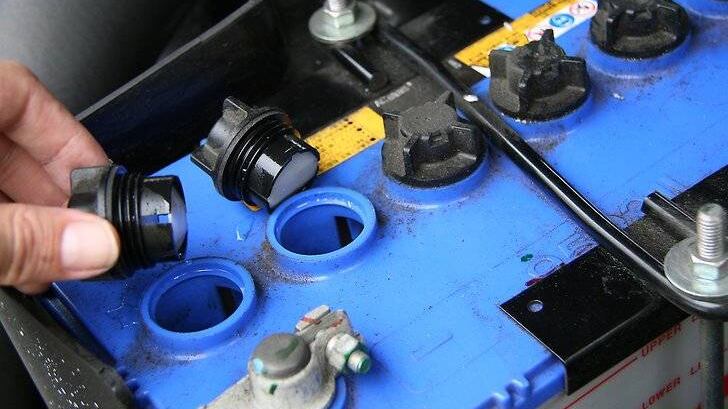 Levanta las tapas de llenado de la batería para revisar el nivel del líquido. Algunas baterías no tienen tapa de llenado porque están hechas para no necesitar agua. Si el nivel de agua es bajo, rellena la batería con agua destilada. Vierte el agua dentro del orificio utilizando un embudo. No llenes demasiado. Espera que el agua llegue al fondo. Limpia las terminales de la batería con un cepillo de alambre cada 6 u 8 meses. Remueve los conectores de la terminal de la batería moviéndolos de un lado a otro, y jalándolos suavemente hacia arriba. Frota el cepillo de alambre en una pasta hecha con bicarbonato de sodio mezclada con agua destilada. Suavemente frota la terminal para conseguir un brillo y remover el ácido seco acumulado. Vuelve a conectar los conectores a la terminal golpeándolos en su lugar con un martillo de goma.