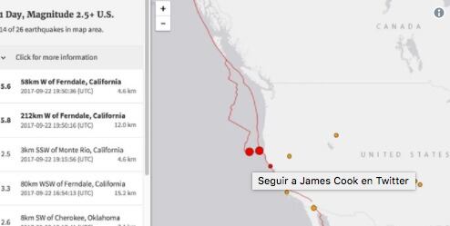 Un sismo de magnitud 5,7 se produjo hoy, 22 de septiembre, en el océano Pacífico frente a la costa norte de California, según reporta el Servicio Geológico de EE.UU. (USGS).