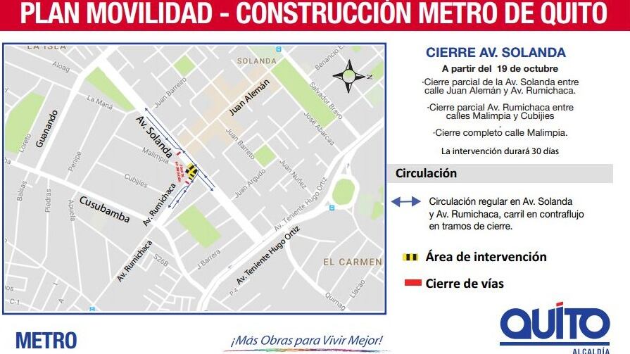 La Empresa Pública Metropolitana Metro de Quito (EPMMQ) informó que este jueves 19 de octubre, desde las 22h00, se producirá cierres parciales en las Avenidas Solanda y Rumichaca y un cierre completo de la calle Malimpia, al sur de la ciudad.