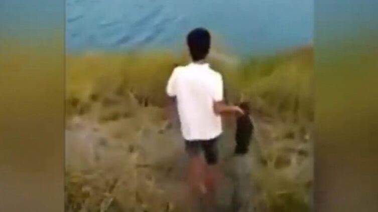 En el clip se puede cómo el individuo saca un cachorro vivo de una bolsa y lo arroja a un río donde hay de cocodrilos.