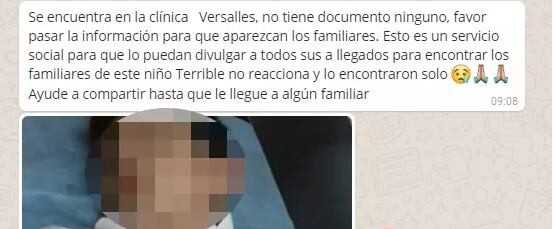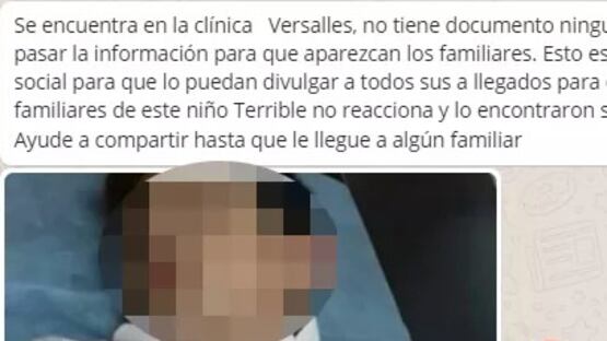 «Se encuentra en la clínica Versalles, no tiene documento ninguno, favor pasar la información para que aparezcan los familiares. Esto es un servicio social para que lo puedan divulgar a todos sus allegados para encontrar los familiares de este niño. Terrible no reacciona y lo encontraron solo …» esta es la cadena que se difunde.
