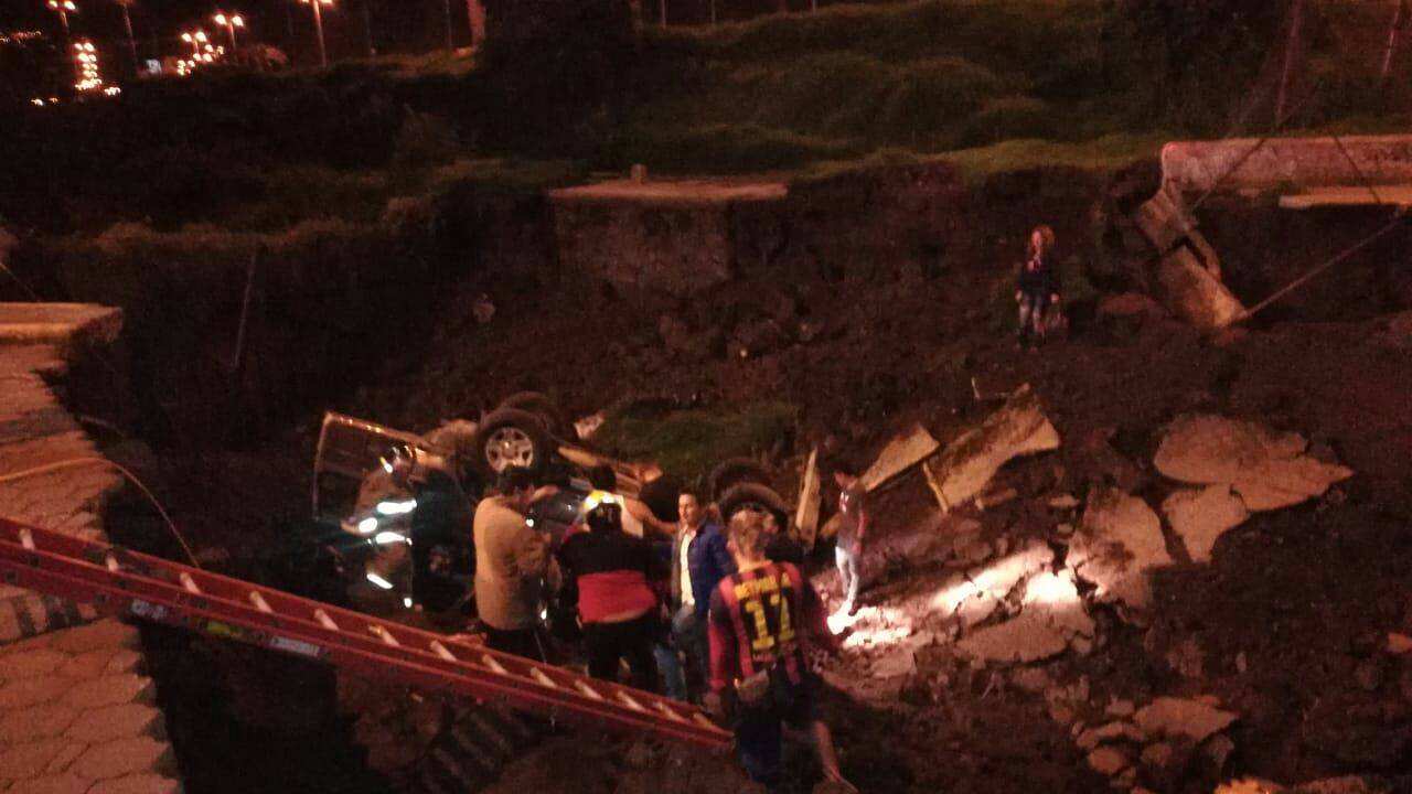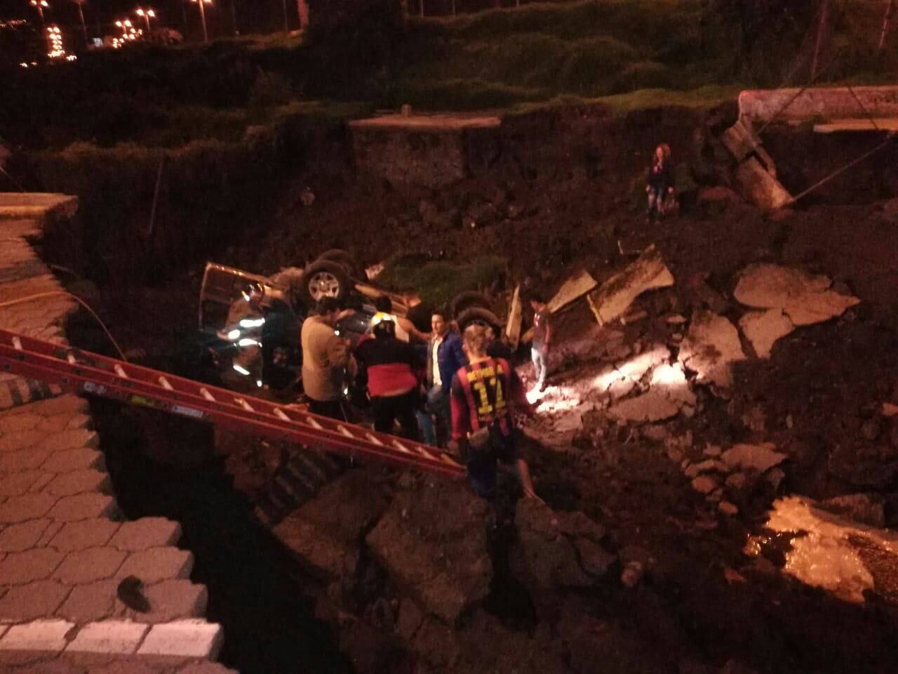 El hecho se dio mientras dos vehículos tipo jeep se encontraban pasando sobre la vía General Píntag y Luis Cordero, en el nuevo ingreso al Parque lineal Santa Clara, ambos vehículos cayeron a un socavón generado tras el derrumbe con un total de cinco personas a bordo.
