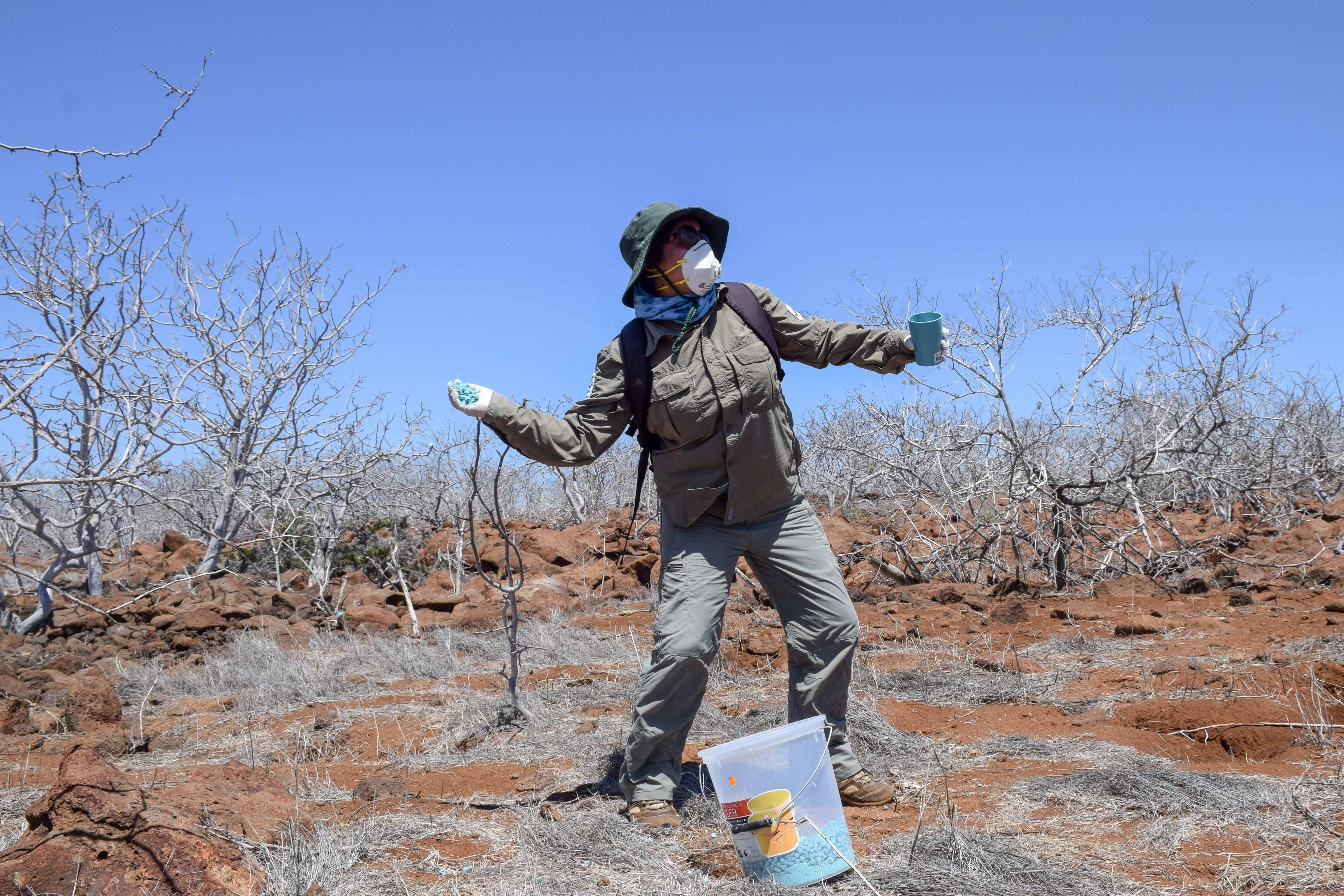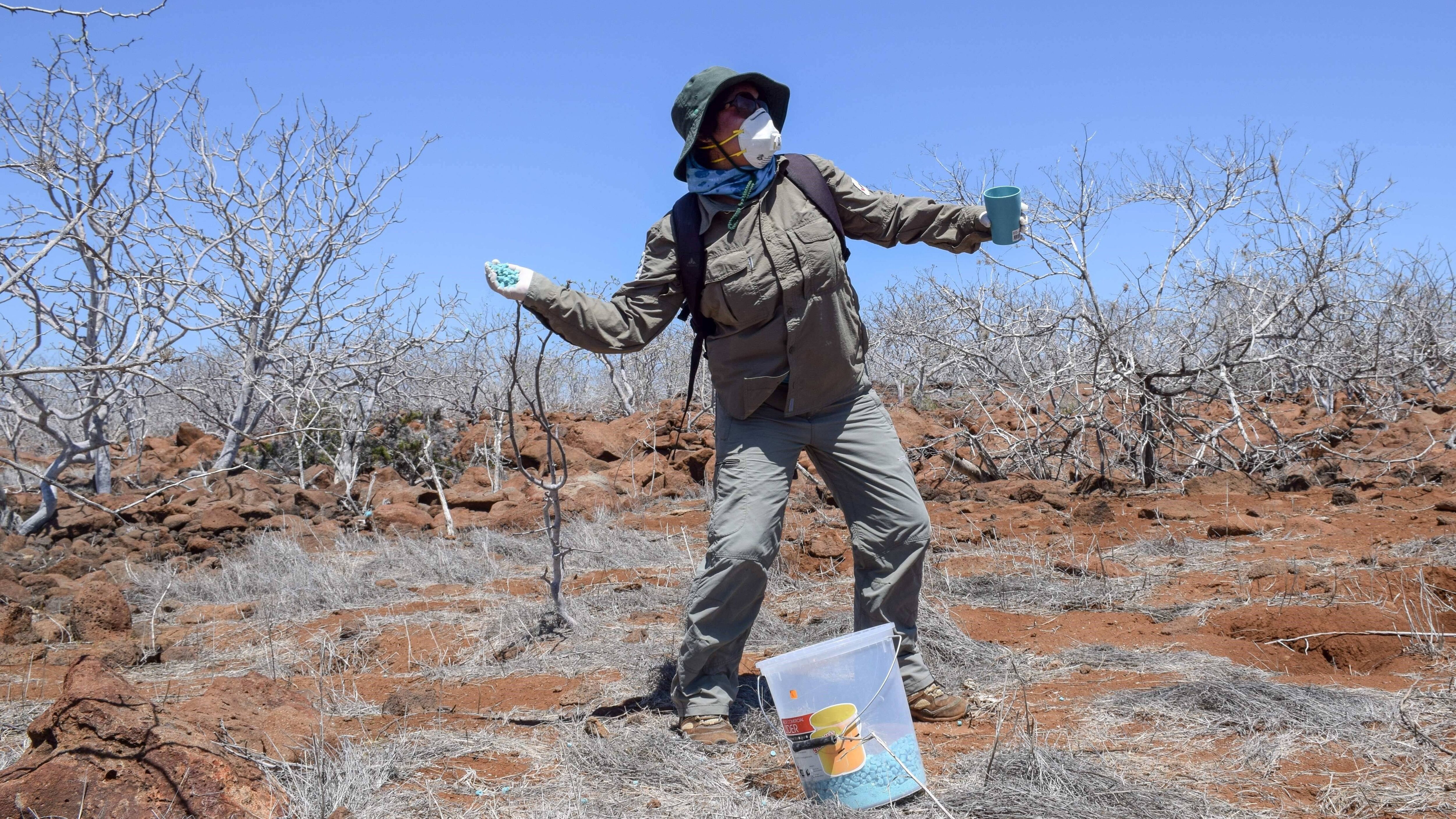 El Parque Nacional Galápagos e Island Conservation emplearon 3.000 kilogramos de raticida para exterminar a los vertebrados invasores, que fue diseñado específicamente para ser utilizado en Galápagos y no afectar las condiciones climáticas de las islas.