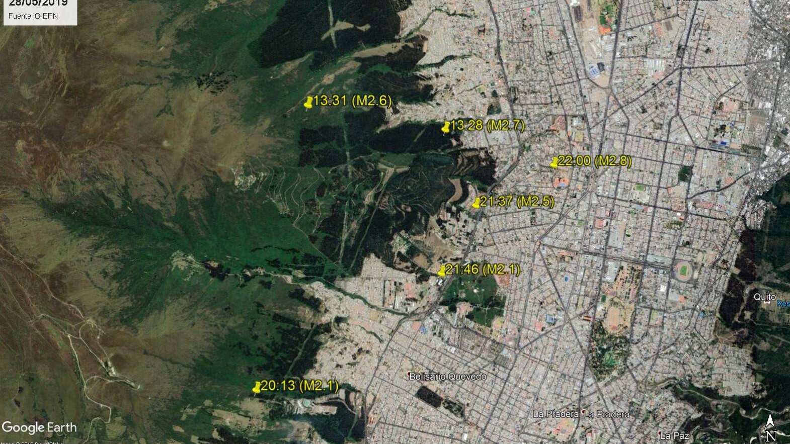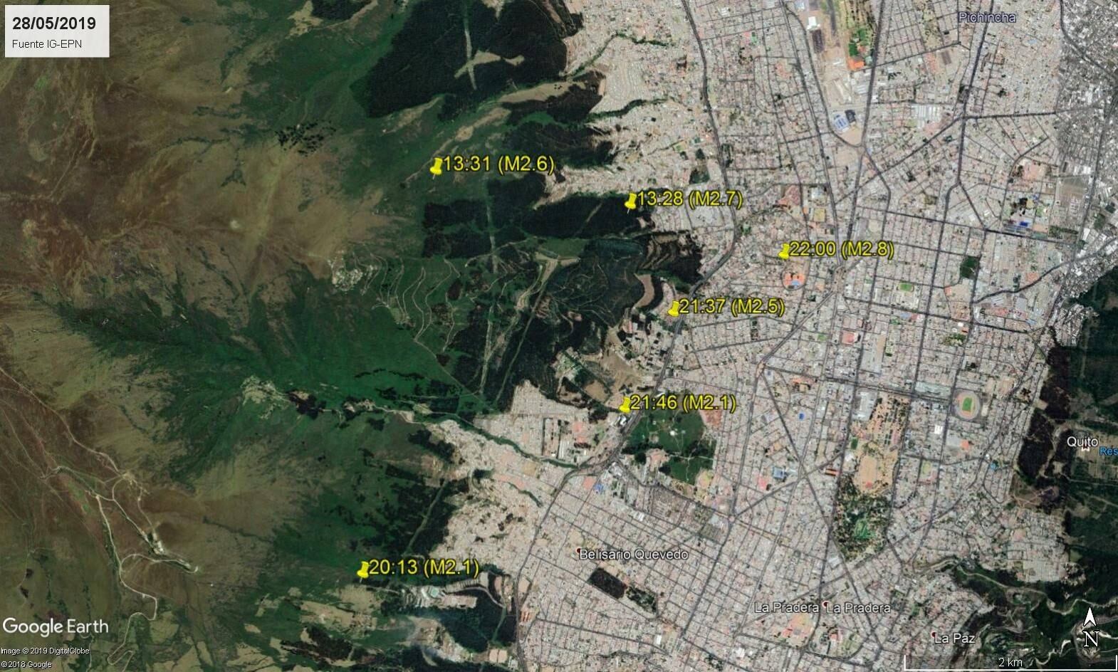 Las magnitudes de los sismos varían entre 1.4 y 2.8 y las profundidades no superan los 7 km. Los epicentros se ubican en el norte de Quito.