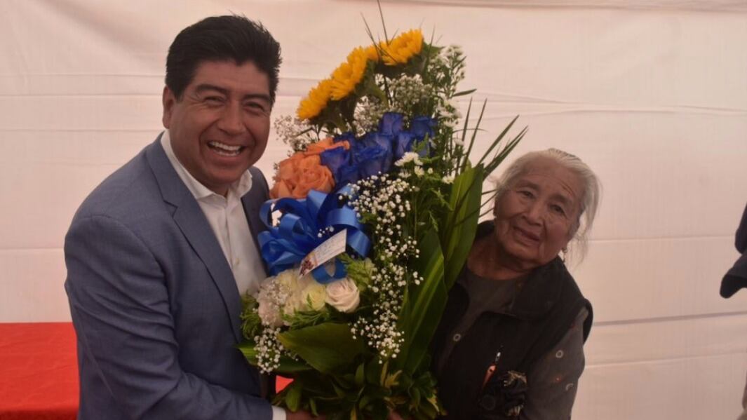 Una de las personas que recibió escrituras le entregó un pequeño detalle al Jorge Yunda. Se trataba de un arreglo de flores de color azul y naranja y obviamente tenía una tarjeta pero el nombre del alcalde estaba incorrecto.
