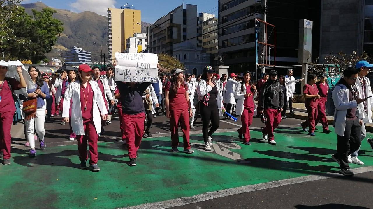 La mañana de este domingo, los internos rotativos de la ‘Corte Septiembre 2019’ se tomaron las calles de Quito. Estudiantes de las carreras de medicina exigieron al Ministerio de Salud se de solución a la reducción del estipendio.