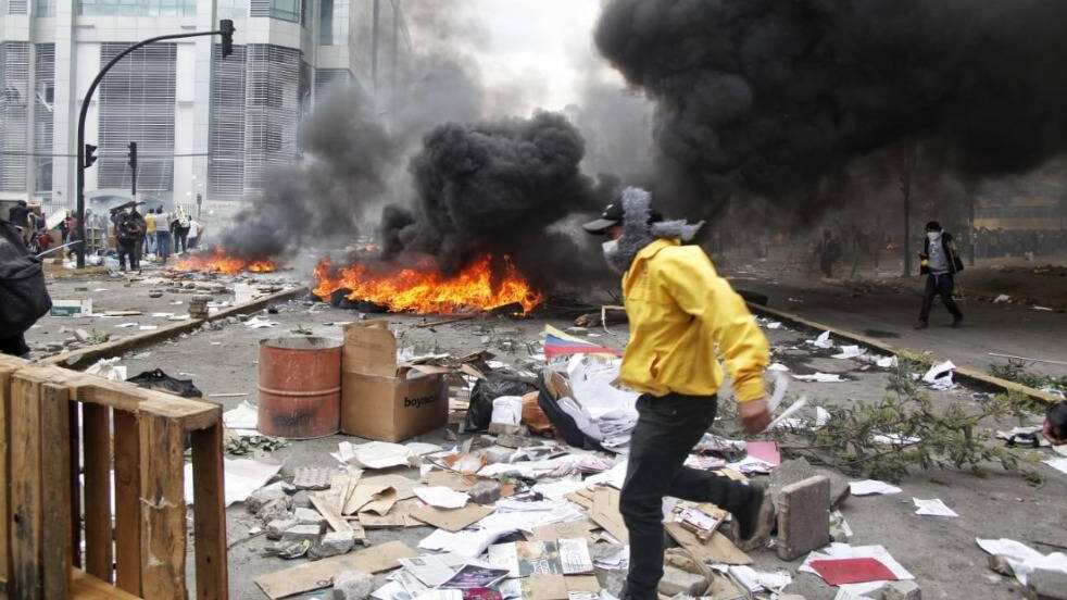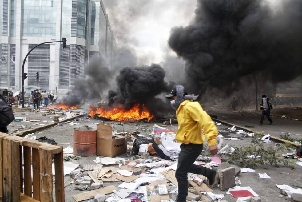 «Informamos: al momento, se registra un incendio estructural en la Contraloría General del Estado, al que personal y vehículos de #BomberosQuito no pueden ingresar por presencia de manifestantes hostiles en el área. #SeguridadQuito«