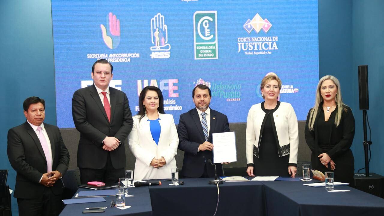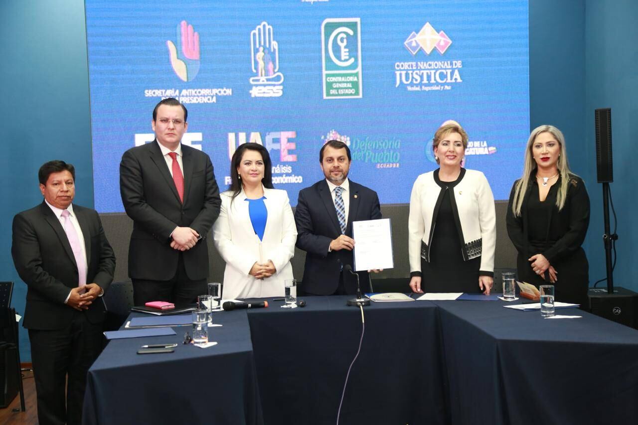 Acto seguido, se invitó a las autoridades de: Fiscalía General del Estado, Corte Nacional de Justicia, Consejo de la Judicatura, Unidad de Análisis Financiero y Económico y Defensoría del Pueblo, a suscribir los Convenios de Cooperación Interinstitucional. María del Carmen Maldonado, Presidenta del Consejo de la Judicatura, destacó el compromiso del Instituto Ecuatoriano de Seguridad Social, por su lucha contra la corrupción mencionó que estas acciones constituyen una necesidad urgente en nuestro país, «la lucha contra la corrupción tiene varias caras y una de ellas sin duda es poder regirnos por un código de ética que nos permita establecer cánones axiológicos necesarios para el desenvolvimiento humano en sociedad», expresó.