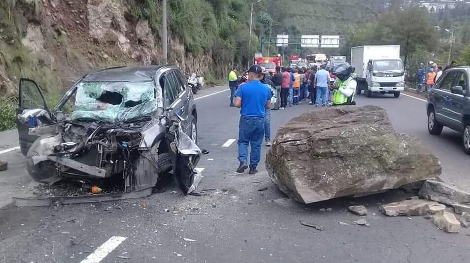 El vehículo que circulaba cerca del mediodía en la Av. Simón Bolívar, a la altura de Guápulo, sufrió el impacto de una enorme piedra. El desprendimiento ocurrió por la erosión del talud a causa de las intensas lluvias de los últimos días.
