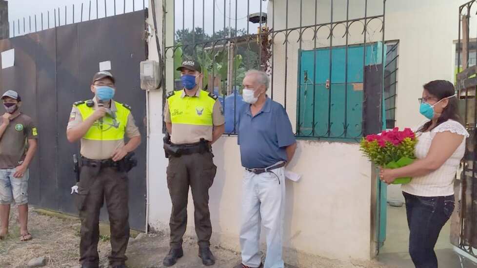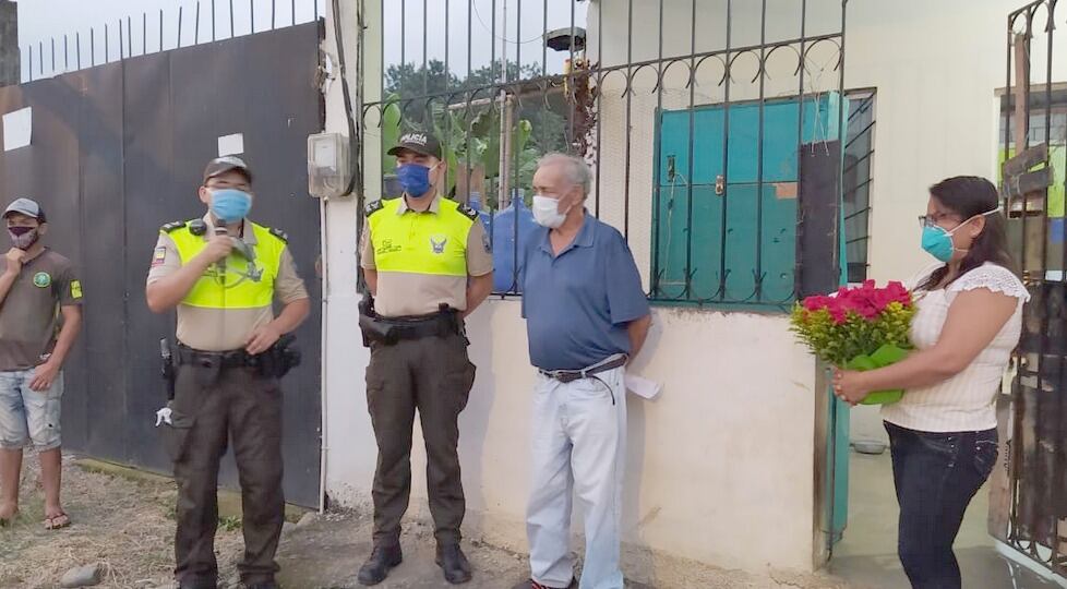 La Policía Comunitaria de Quevedo rindió un justo homenaje al adulto mayor Jorge Rosero, de 75 años, quien logró superar el coronavirus, él fue el primer caso de Covid-19 en ese catón de la provincia de Los Ríos.
