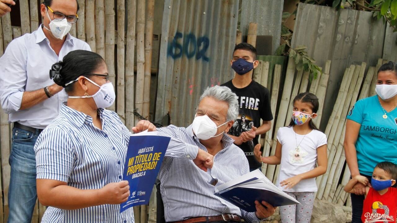 El presidente Lenín Moreno participó la mañana de este viernes en la entrega de títulos de propiedad a familias de Monte Sinaí. También visitó a María Tapia, propietaria de una panadería en el centro de Guayaquil, quien es beneficiaria del programa Reactívate Ecuador.