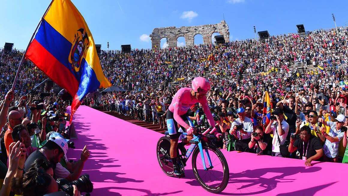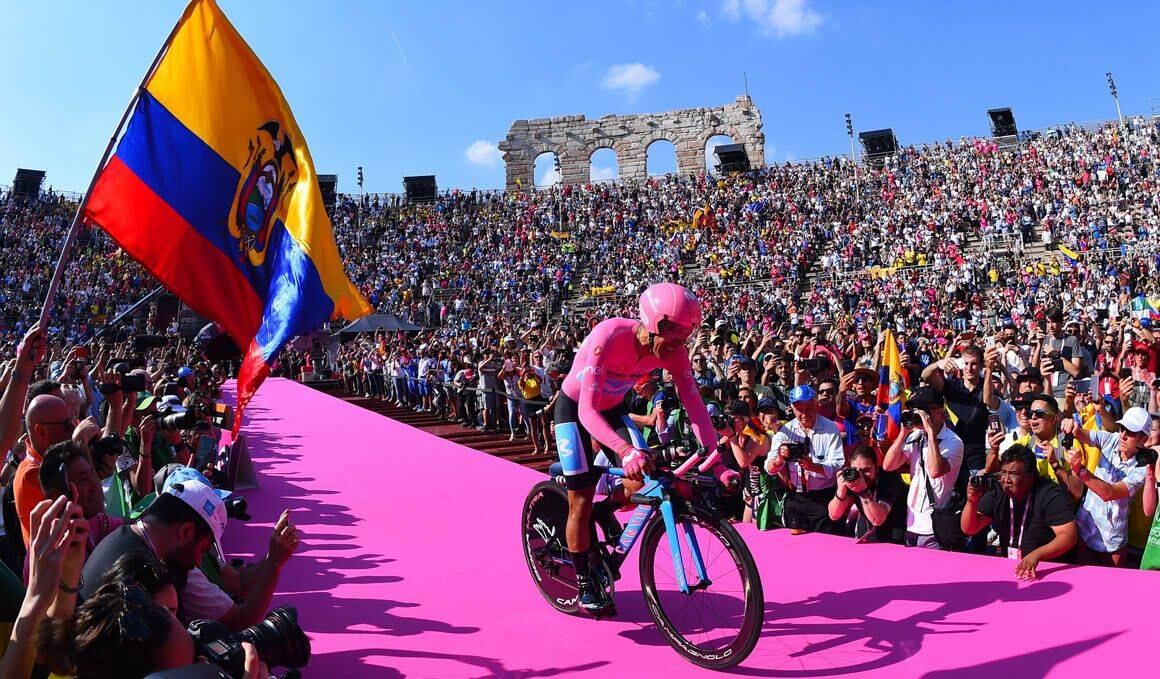 En la etapa 21 del Giro de Italia 2019, la ‘Locomotora del Carchi’ llegaba a la meta con lágrimas en sus ojos porque era el nuevo campeón, hito para el Ecuador. En la etapa 14 se había puesto el ‘maillot rosa’ y no se lo quitó más.