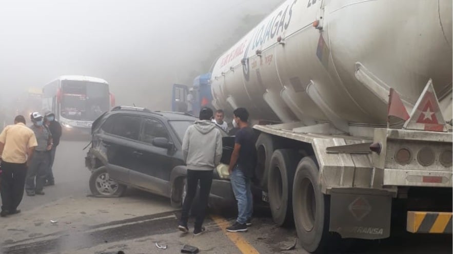 En el video se observa que el vehículo tipo camioneta intentó sobrepasar a un camión, pero se impactó con un tanquero. El auto quedó incrustado en las ruedas del camión.