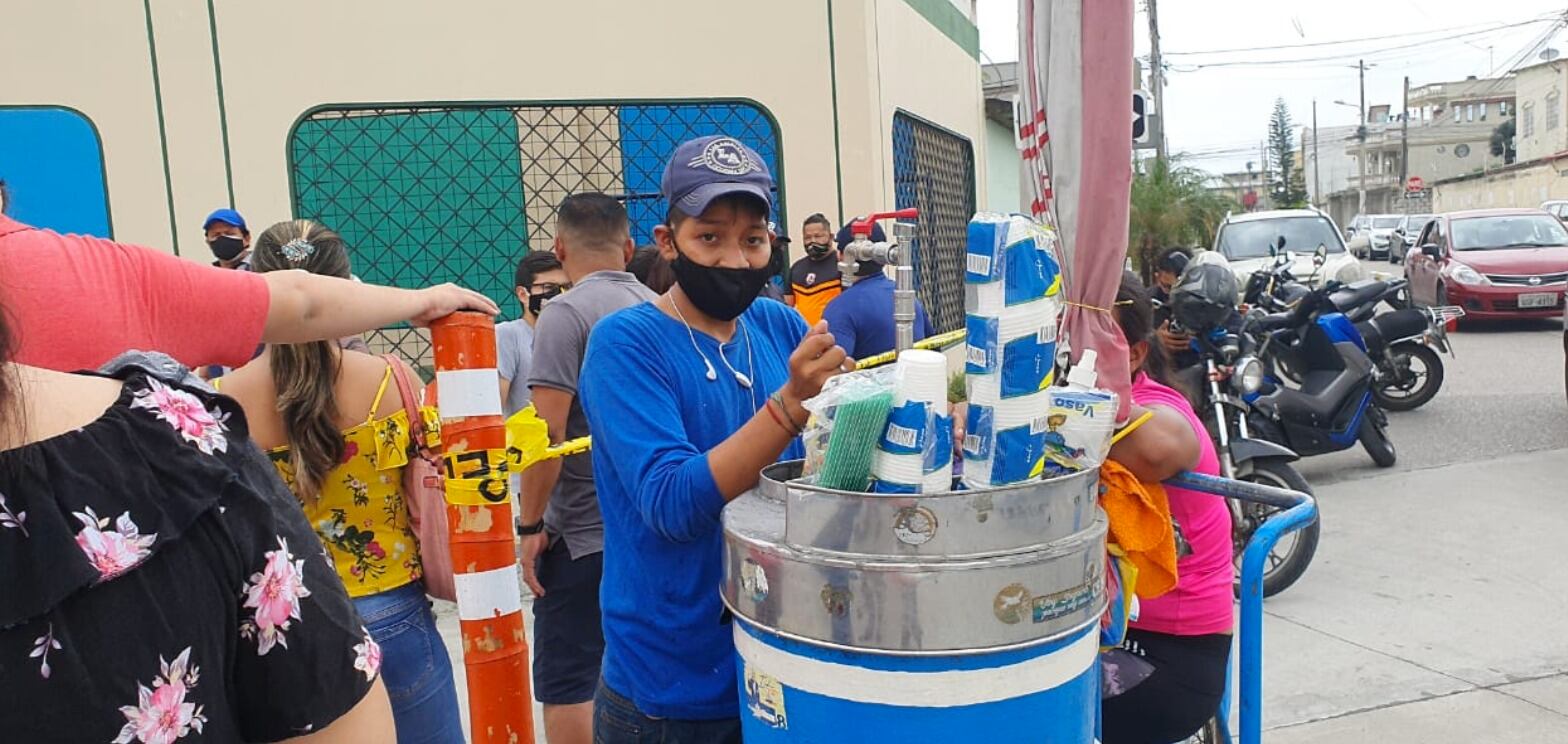 Vendedores de botellas de agua, jugo de coco y alimentos como empanadas y pasteles esperan en las esquinas de los recintos electorales de Guayaquil para ofrecer los productos a la ciudadanía.