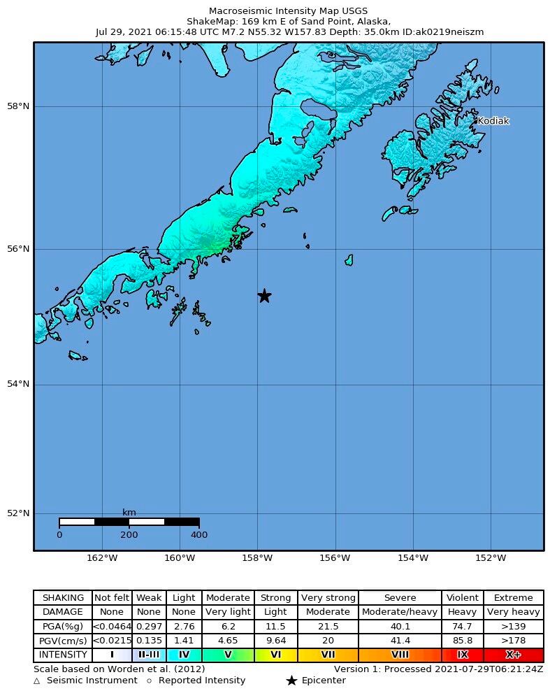 El terremoto de magnitud 8,2 se vio acompañado de una veintena de temblores de menor consideración y diferente profundidad en la misma región, a unos 120 kilómetros de Chignik (Alaska), entre los cuales el siguiente más fuerte alcanzó una magnitud de 6,2 y cuyo hipocentro se registró a 42 kilómetros de la superficie.