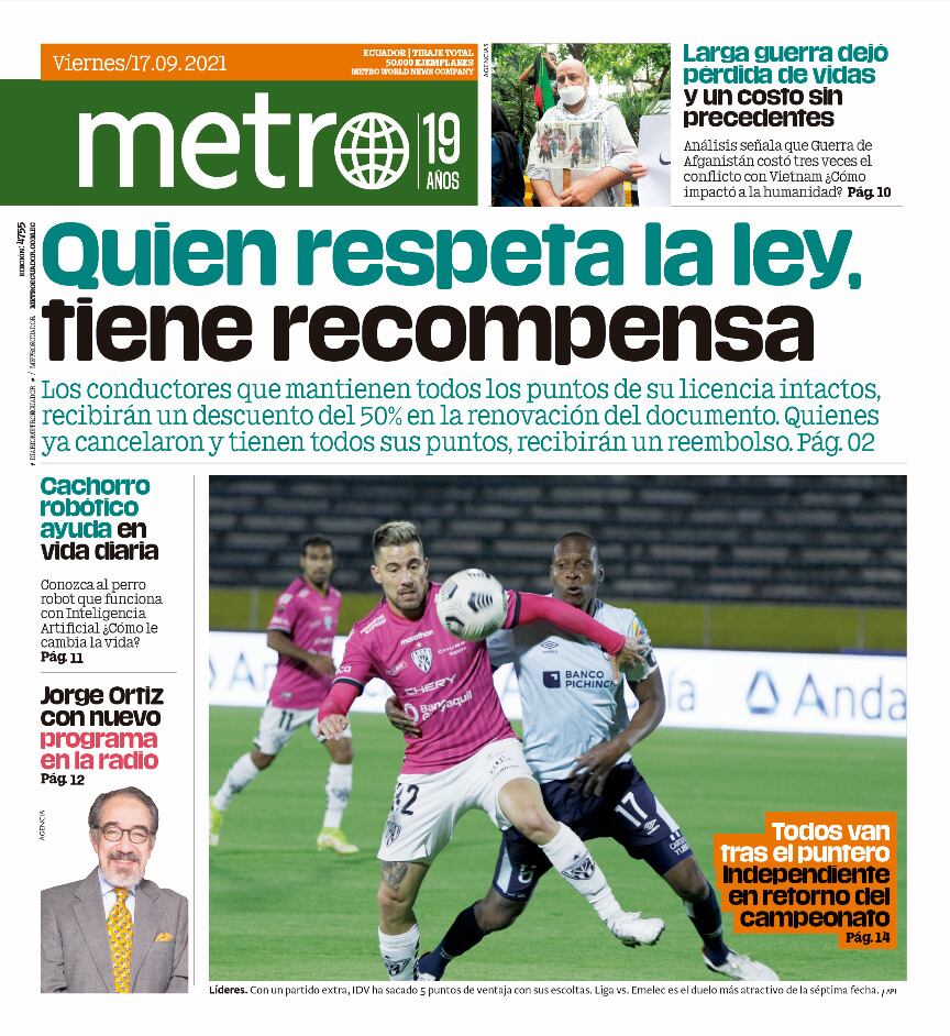 Excelente viernes, estimados lectores. Metro Ecuador presenta su edición digital para este viernes 17 de septiembre. Podrás encontrar lo siguientes temas: ¿Cómo se reembolsará el dinero por la licencia?; el cambio de aceite alarga la vida del motor; el costo de la guerra de Afganistán y más.