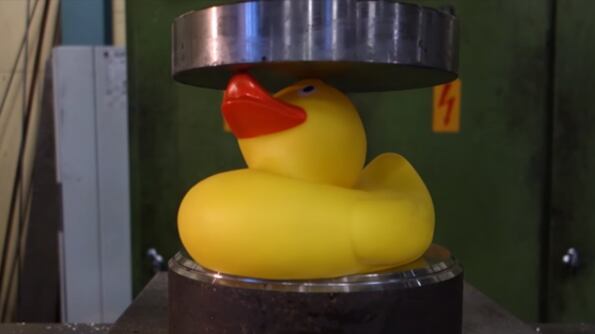 Una vez más la prensa hidráulica hizo de las suyas. Ahora fue el turno del famoso patito de hule quien “sobrevivió” firmemente al poder de la prensa.