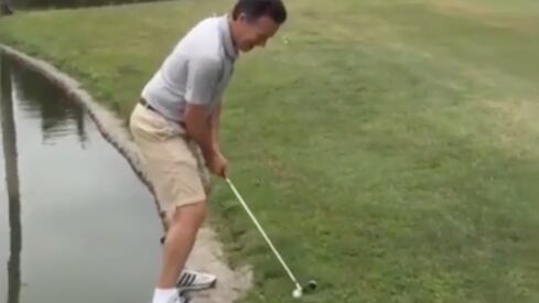 El golfista estadounidense que se ve en el video tuvo que tirar la pelota al borde de un estanque. Sin duda un lanzamiento con mucha dificultad, pero nada de imposible. Una vez que logró tirar la pelota el golfista cae al estanque donde no pudo contener la risa. A pesar de su caída, la risa de él lo dice todo.