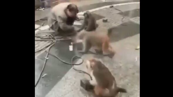 En la web circula este video que muestra a un hombre mientras este intentaba adiestrar a un grupo de simios en las calles de China; sin embargo uno de ellos tomó el cuchillo y amenazó al hombre.