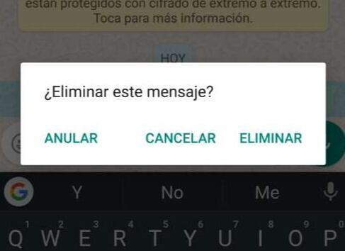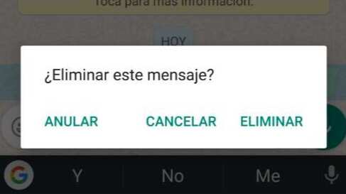 Cancelar está por demás explicarla, pero anular y eliminar son importantes. La diferencia entre estas dos, radica en que eliminar sólo aplica para el dispositivo del usuario, y anular hará que el mensaje, video o audio no vuelva a mostrarse en ningún dispositivo.