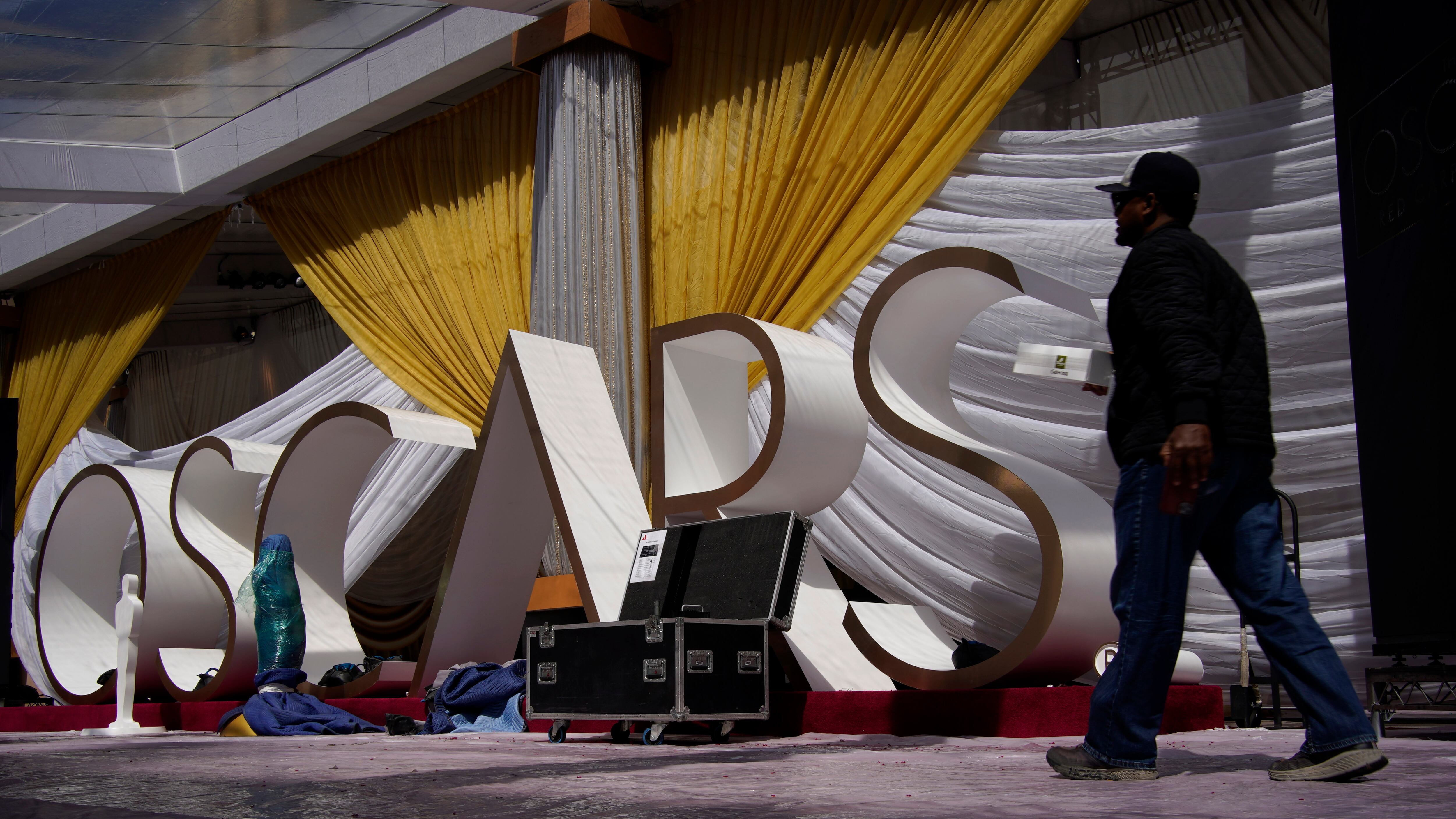 Una persona camina por la alfombra roja durante los preparativos para la 94ta entrega anual de los Premios de la Academia del domingo afuera del Teatro Dolby en Los Ángeles el viernes 25 de marzo de 2022. (Foto AP/John Locher) (John Locher/AP)