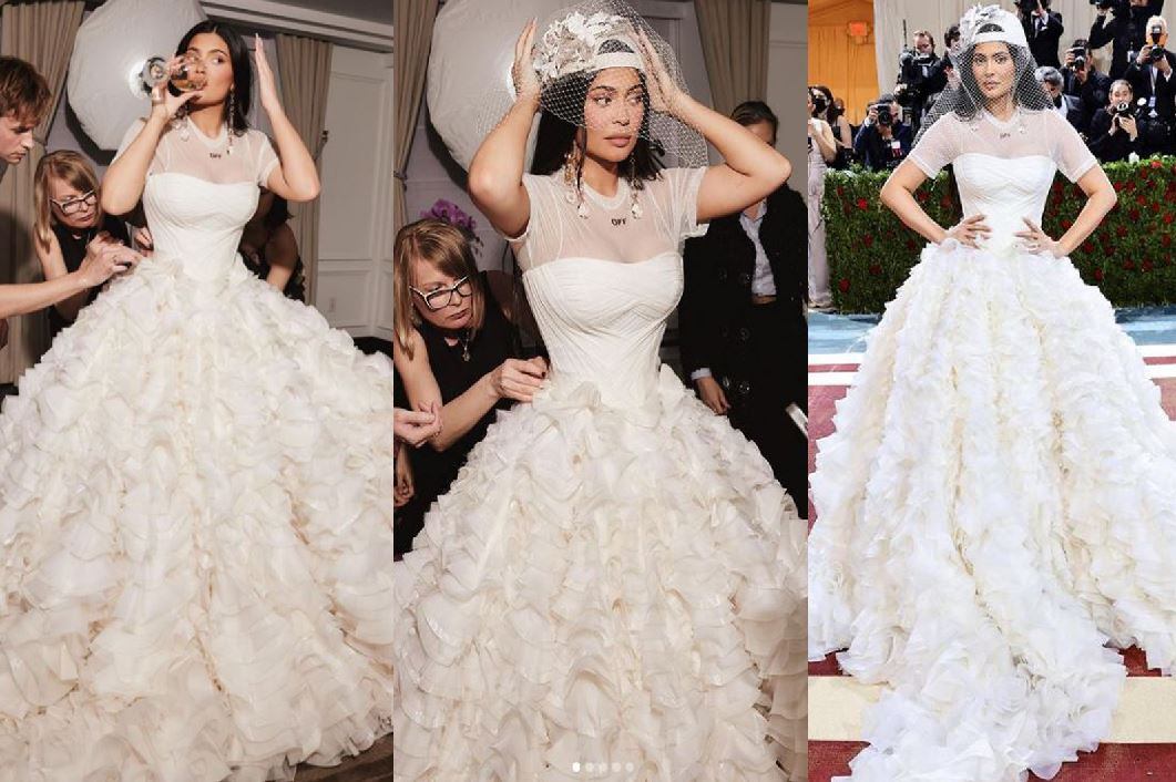 La menor del clan Kardashian-Jenner apareció en el prestigioso evento del Museo Metropolitano de Arte de Nueva York en su edición 2022 con un traje de novia muy particular de la firma Off White y llamado con el título de “Poetry Dress”.