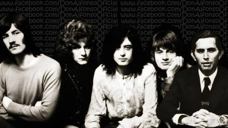 En la primera imagen, aparece una de las portadas de la reconocida banda Led- Zeppelin, a blanco y negro. A un costado, de izquierda a derecha, se encuentra el presentador de Televistazo, cuando recién estaba en sus primeros pasos por la televisión ecuatoriana.