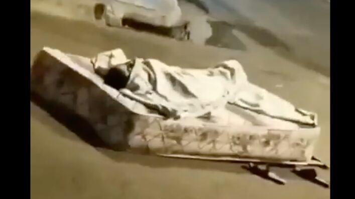 Una persona envuelta en sábanas y acostada en un colchón encima del asfalto se llevó el protagonismo de los rezagos que dejaron los temblores. Otro detalle que se pudo ver en las imágenes son las chancletas que tiene al lado de su “nueva habitación” que evitará ponerlo en riesgo si es que vuelve a moverse la tierra.