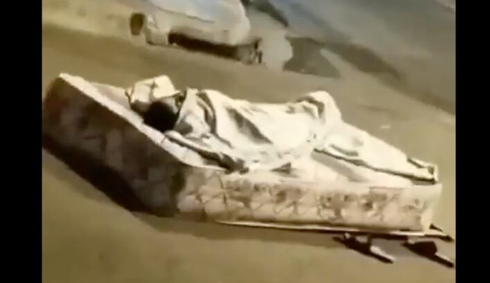 Una persona envuelta en sábanas y acostada en un colchón encima del asfalto se llevó el protagonismo de los rezagos que dejaron los temblores. Otro detalle que se pudo ver en las imágenes son las chancletas que tiene al lado de su “nueva habitación” que evitará ponerlo en riesgo si es que vuelve a moverse la tierra.