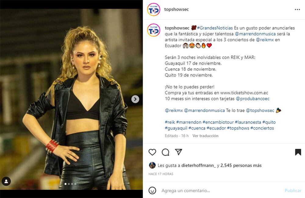 Asimismo, fue el mismo ´Top shows´ quien compartió la noticia de que la intérprete del más reciente y sonado éxito de Ecuador, ´Laura no está´ estará junto a Reik durante sus tres puestas en tarima. “#GrandesNoticias Es un gusto poder anunciarles que la fantástica y súper talentosa @marrendonmusica será la artista invitada especial a los 3 conciertos de @reikmx en Ecuador 🙌🏻😍👏🏻🔥❤️Serán 3 noches inolvidables con REIK y MAR: Guayaquil 17 de noviembre. Cuenca 18 de noviembre. Quito 19 de noviembre”, es el texto que acompaña al post publicado por la empresa.